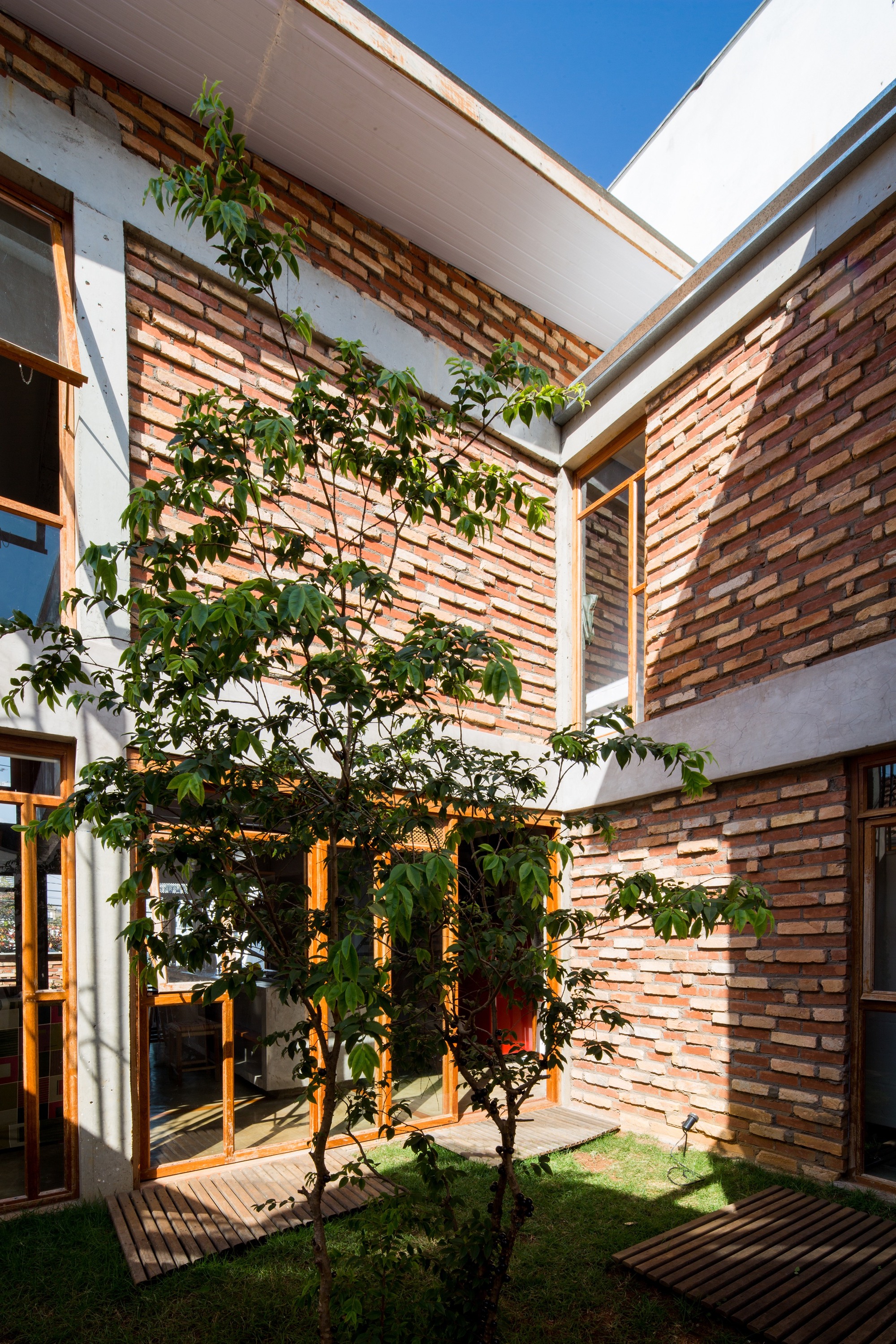 Algo da materialidade do antigo continua no novo. As paredes são compostas por uma composição de tijolos de demolição da antiga casa com tijolos novos; o piso do mezanino, tanto estrutura quanto tábuas, são da demolição; os caixilhos madeira tem seu desenho pois são conformados por lâminas de vidros temperados descartados; boa parte dos eletrodutos, louças, metais, vitrôs, guarda roupas, armários, são extratos que quando necessário sofreram operações para se adaptar ao seu novo sítio.