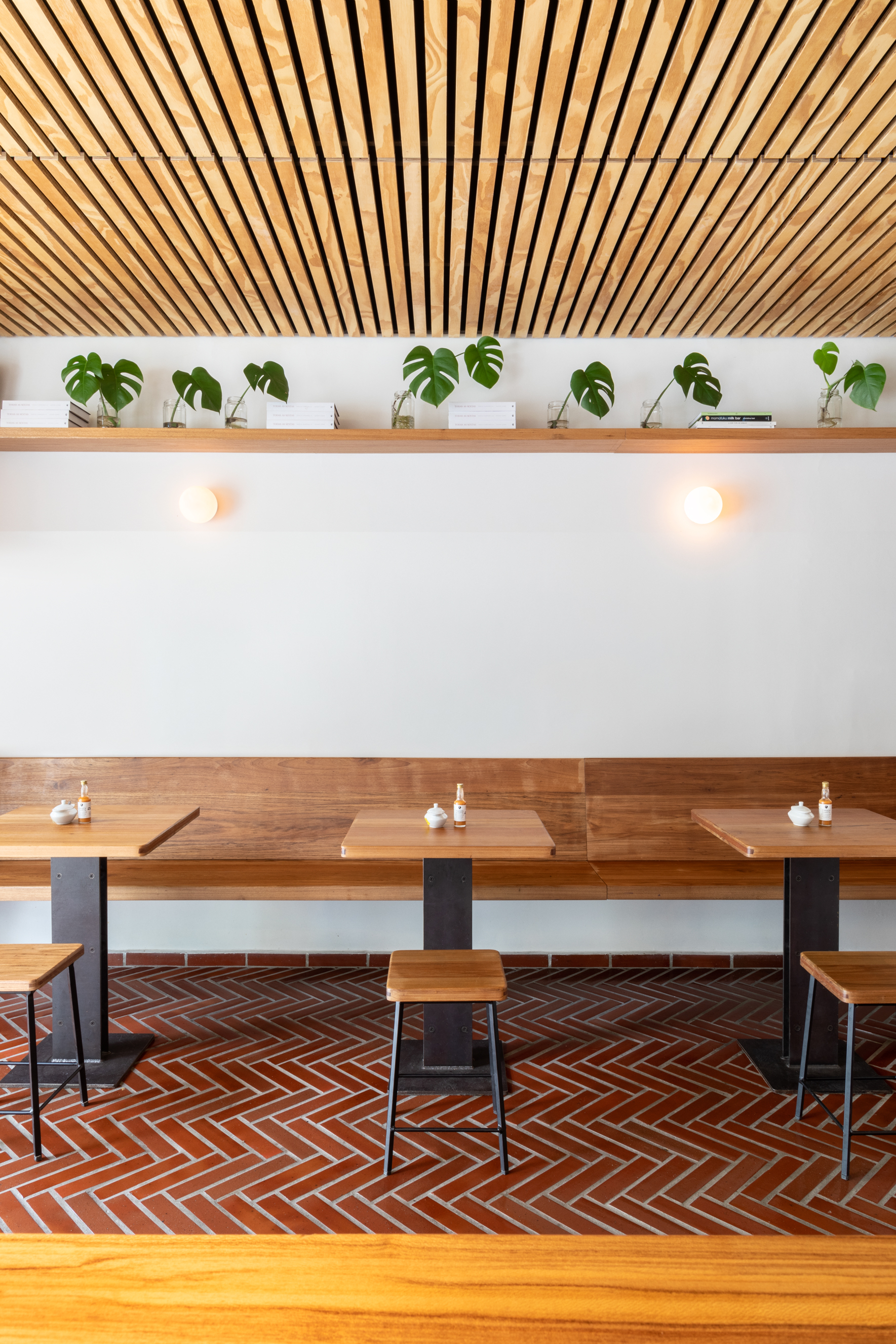 Duas opções de permanência foram criadas, uma fileira com mesas e uma com balcões de banquetas altas para refeições mais rápidas. A iluminação é feita a partir de arandelas que fazem a iluminação geral no ambiente e pendentes com cúpulas que focam nos balcões. O cardápio funciona como um outdoor no qual trilhos metálicos permitem que módulos expositivos possam ser trocados de acordo com o cardápio do dia.