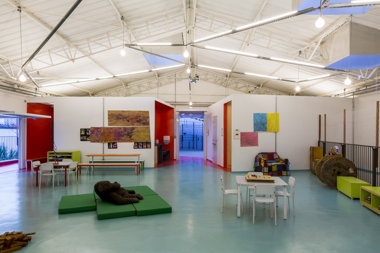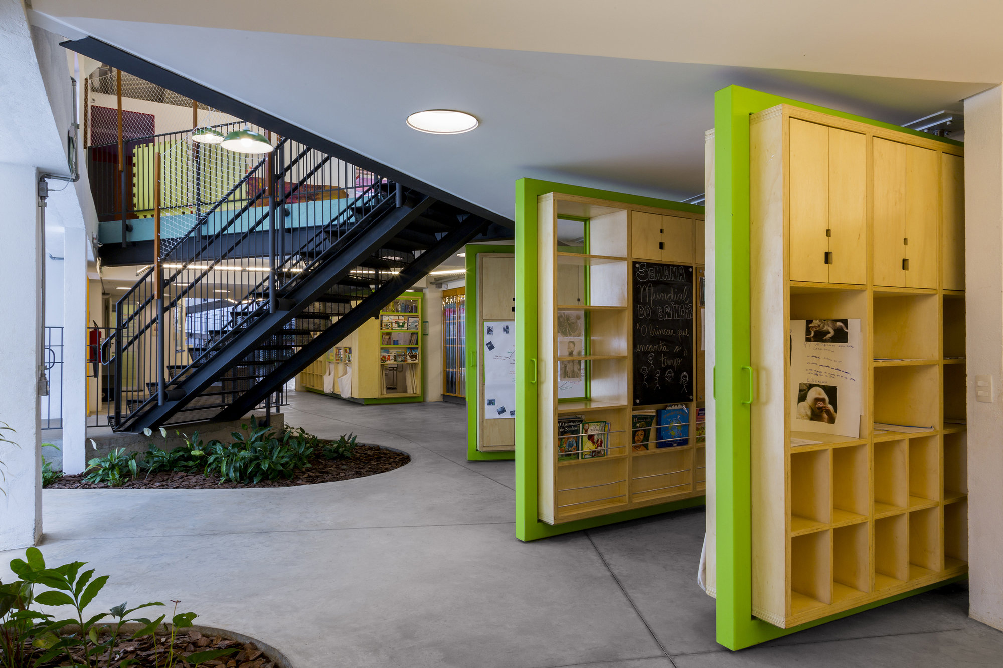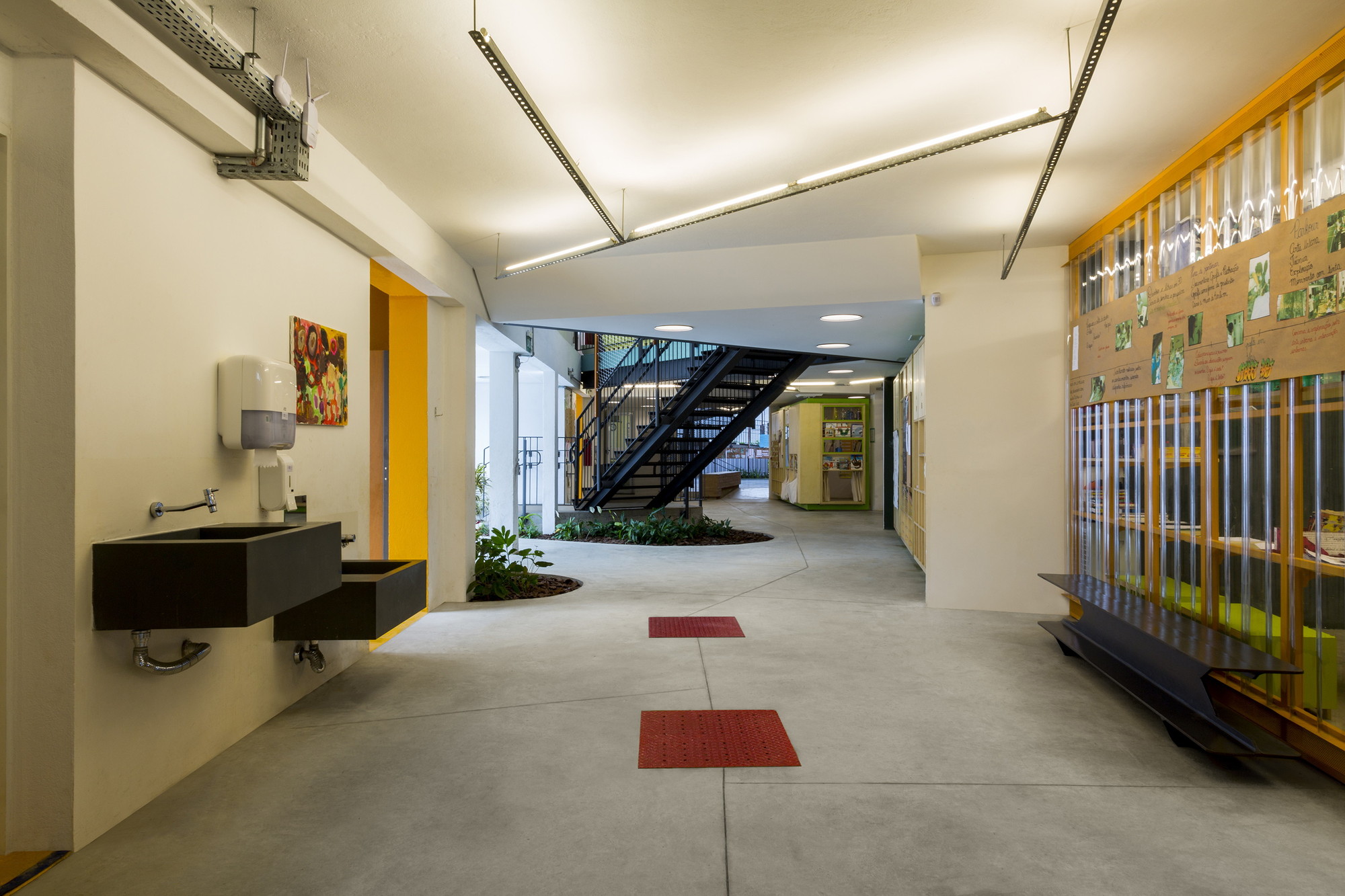 Abordamos a planta como território composto por zonas de contração e expansão, em que existem fronteiras e bordas, mas elas sãotênues, permitindo e incentivando a transgressão, catalisando a apropriação imaginativa, entendendo as crianças como sujeitos ativos.Os corredores, lugares em que a única função é o movimento contínuo do ir e vir, não existem. Todos ambientes sãoexpansões da sala de aula formal e propícios para a assimilação de conhecimento.Consequentemente, para chegar de um ponto ao outro, é possível escolher diferentes percursos, diferentes interações, escolher o que encontrar e o que não.